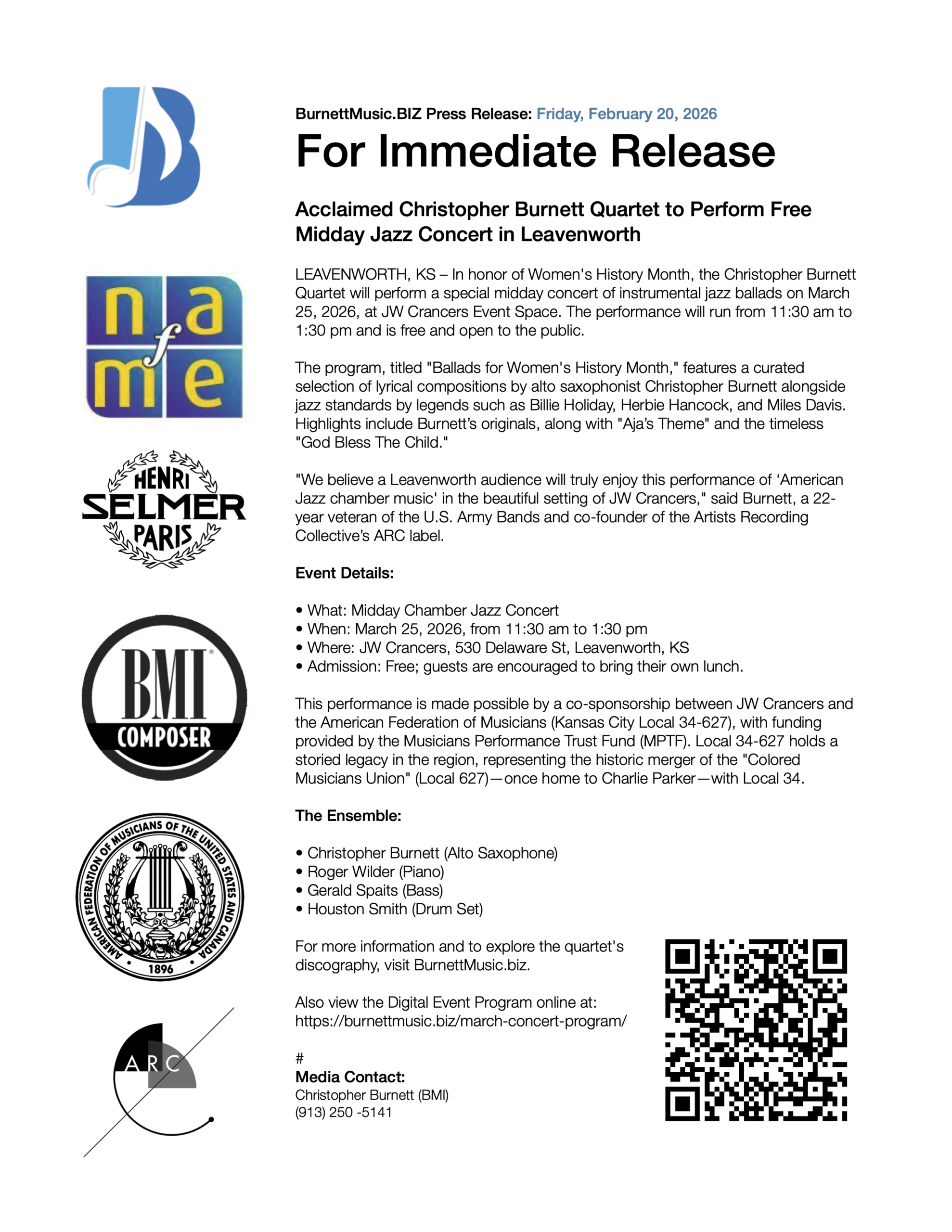 Beyond the stage, Mr. Burnett is a highly regarded clinician who has presented for the Missouri and Kansas Music Educators Associations. He is the co-founder of the Artists Recording Collective (ARC) and continues to shape the regional jazz landscape through his work as a performer, composer, and advocate for jazz as a form of “refined chamber music.”